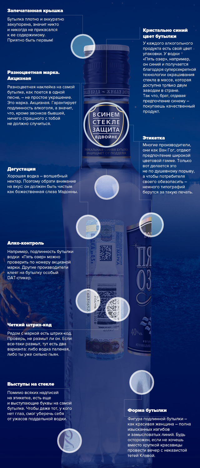4. Качественный алкоголь. Алкоголь. То самое, что поможет забить болт на все остальные неудачи из списка (осторожнее с п.1). То самое, что изящно раскроет вкус первого весеннего мяса, приготовленного на открытом огне. Вообще, как часто, говоря «мир-труд-май», мы подразумеваем «майские-шашлык-водка»?.. Короче, на качественном алкоголе, как всегда, лежит большая ответственность; и если в вашей компании принято выпивать от всего сердца и как в последний раз, то нельзя взять и так просто купить водку в ближайшей палатке. Есть пункты на которые нужно обращать внимание, чтобы быстро отличить качественный товар от контрафакта: