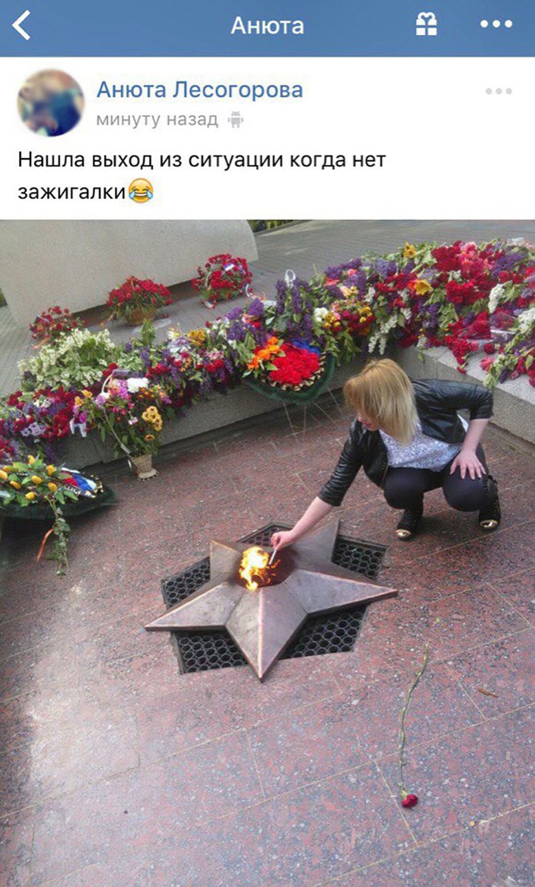 В городе Кисловодск некая Анна сделала снимок, где она поджигает сигареты от Вечного Огня у мемориала. Причем ловко подгадала момент, когда там стояли венки и цветы к Дню Победы. Барышню тут же затравили в социальных сетях, делом заинтересовалась прокуратура. Теперь ей грозит реальное уголовное дело и достаточно серьезное наказание.