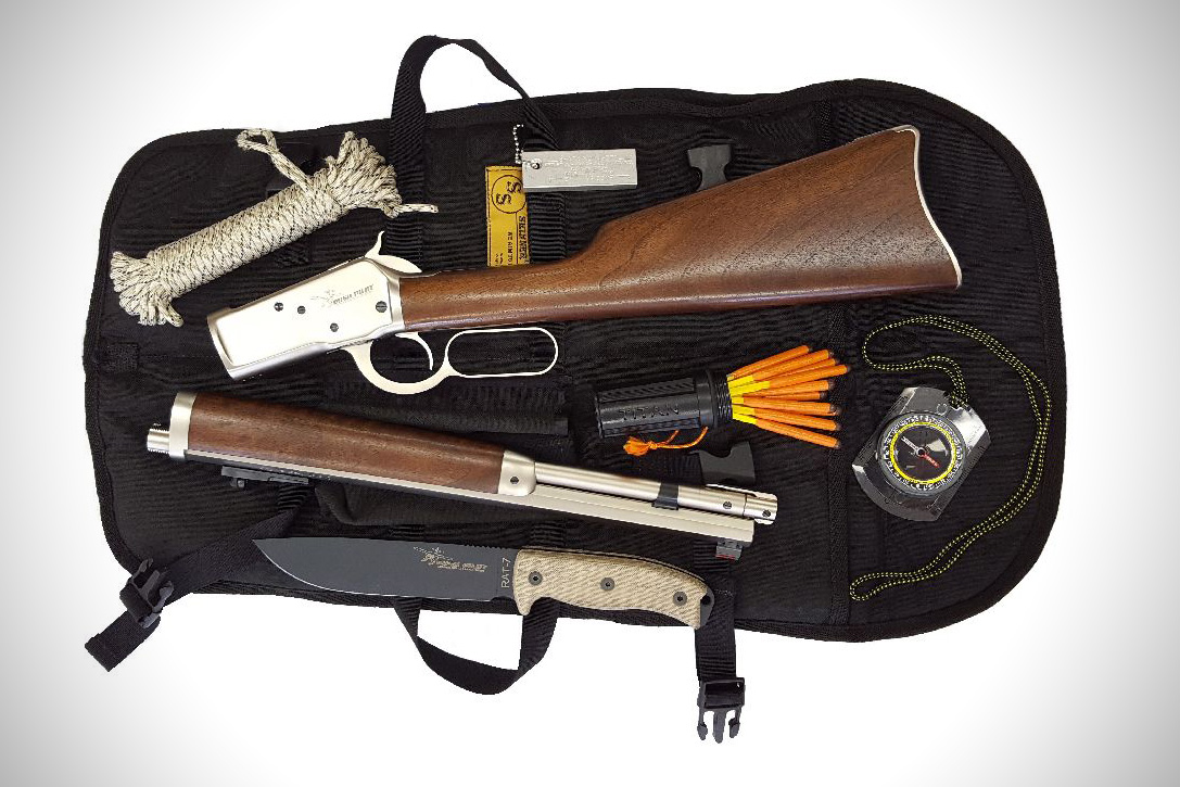Основа набора – лёгкий раскладной карабин Chiappa .44 Magnum с прикладом из орехового дерева. 5+1 патрон, перезаряжается при помощи скобы Генри.