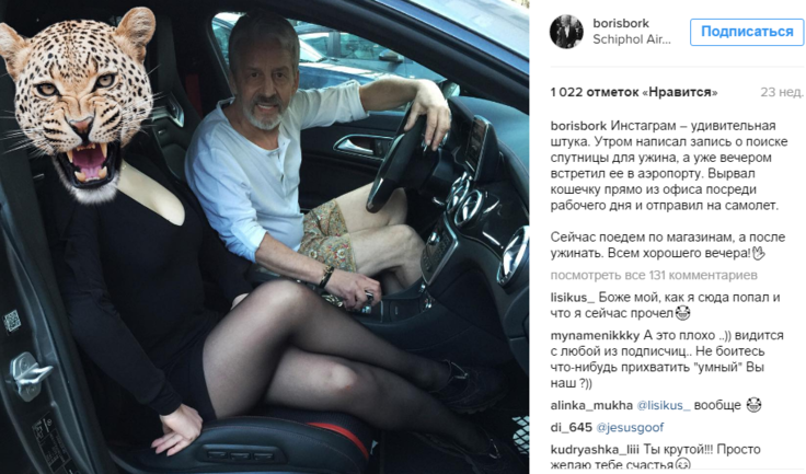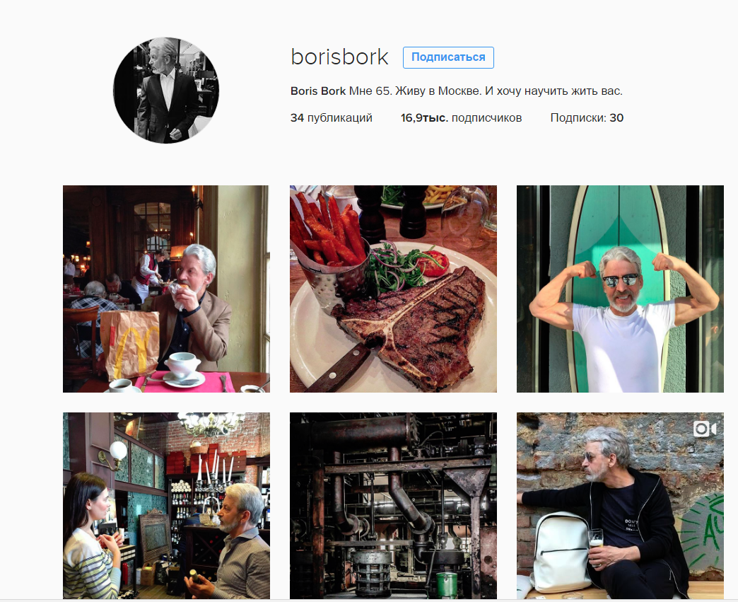 Какие-то чуваки из Москвы, занимающиеся пиаром, взяли в Химках обычного деда-пенсионера. Реально совершенно обычного, такие в тапочках и фланелевой рубашке в клеточку мусорное ведро к контейнерам выносят в каждом дворе. А потом над дедом основательно поработали: умыли, причесали, достали на время дорогую одежду, аксессуары и завели для него аккаунт в сети Инстаграм. Там он предстал в роле загадочного миллиардера по имени Борис Борк. Седой импозантный мужчина как бы ненароком показывает своё богатство и пишет глубокомысленные посты.