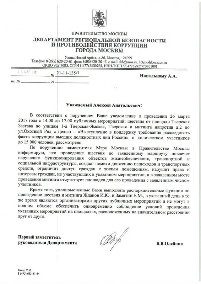 Столичная мэрия заявила о невозможности проведения на Тверской улице в Москве митинга по следам расследования ФБК о «тайной недвижимости» председателя правительства Дмитрия Медведева. Ответ властей Москвы подавший заявку о соответствующем марше оппозиционер Алексей Навальный опубликовал на своем сайте.