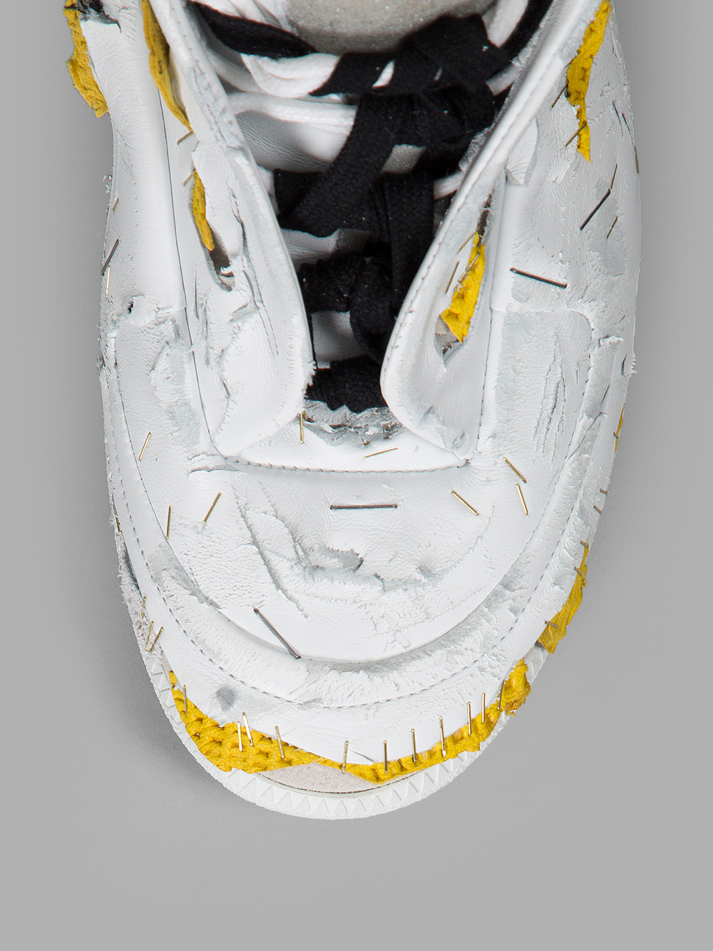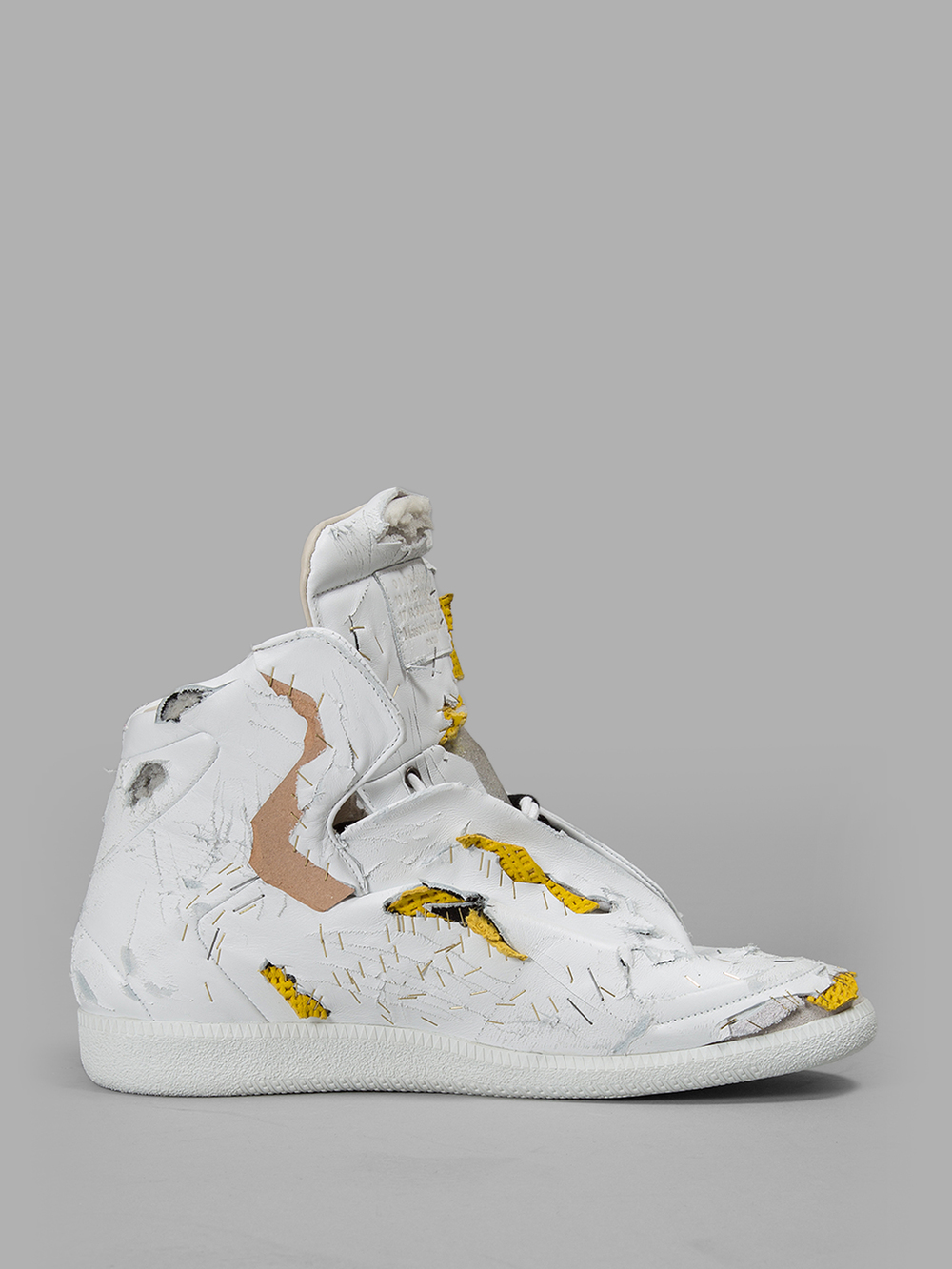 А вы бы купили себе драные дырявые кроссовки, изрезанные и "отремонтированные" при помощи степлера? Вот такие, как на фотографиях. Сразу хотим посрамить скептиков – это не рванина, а модные тапки от дизайнера Maison Margiela, причем из самой модной коллекции Destroyed Future High-Top. Подобными вещами принято восторгаться, шептать что-то про авторский замысле, "не такой как все" и тянуться за кошельком.