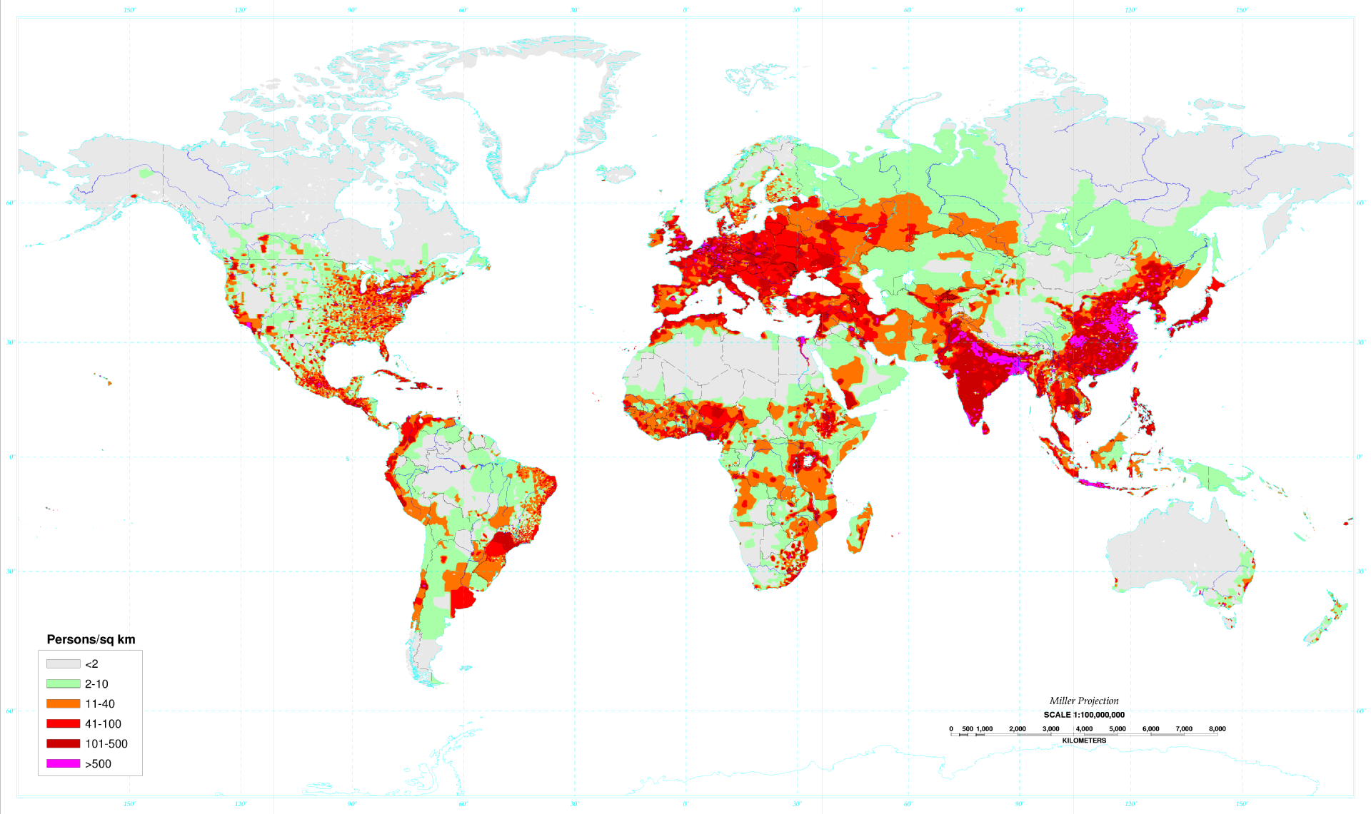 Это карта плотности населения на планете. А население по данным на 2017 год составляет 7,6 млрд человек. Серые зоны – там живет менее 2 человек на 1 квадратный километр. Зеленые – от 2 до 10. А потом чем краснее – тем темнее. Заканчивается всё в пурпурной зоне, там 500+ человек на квадратный километр.