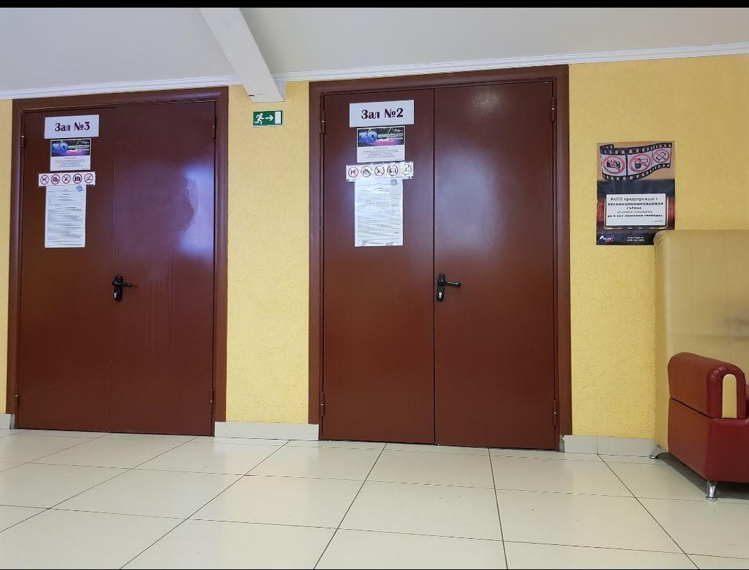 А вот самое страшное – двери кинозалов. Мы уже писали, что под торгово-развлекательный центр отдали старое здание фабрики. А новый хозяин по поводу дизайна особенно не заморачивался, экономили на всём. Писалось, что многие помещения были отделаны дешевым горючим пластиком, которые очень хорошо горит, выделяя при этом ядовитый дым. Тут на фото еще одна крайность: дешевые стальные двери. Примерно такие ставят на подъезды и в тамбуры, это не двери из жести, которые ставят в квартиры. И двери эти были закрыты на ключ.
