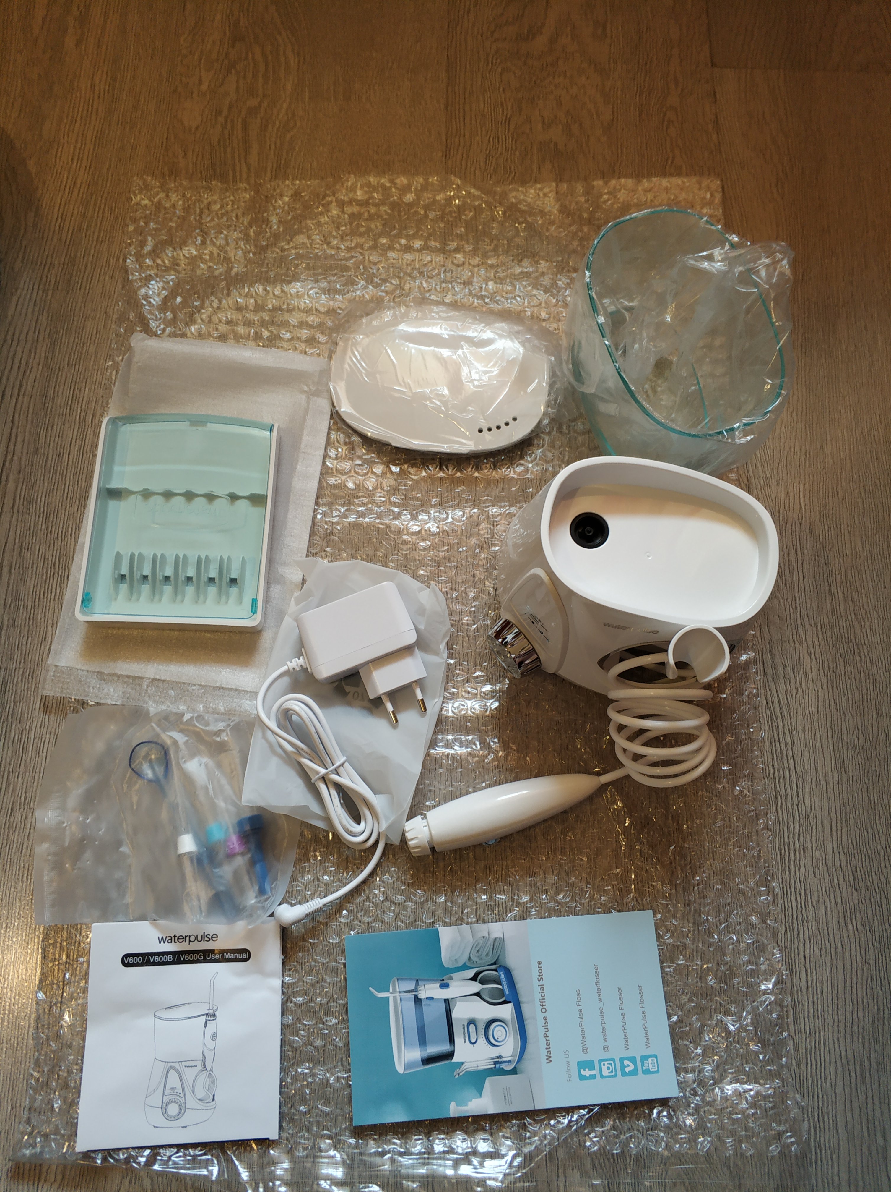 Далее, идет сам набор с ирригатором. Тут собственно в большинстве своём все стандартно. Сам блок ирригатора, с ручкой для насадок, ёмкость на 700 мл, крышка от емкости, набор насадок (о нем чуть подробнее далее), футляр для хранения насадок, блок питания 12V 1A класс IP20! (защиты от воды нет!) и инструкция на англ. языке со вкладышем-рекламкой.