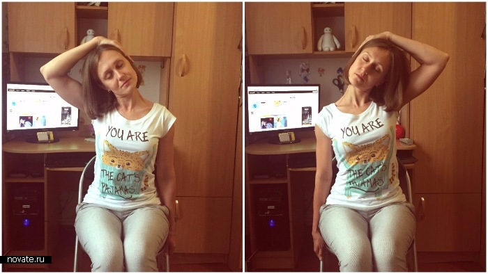 Наклонять голову следует медленно, ни в коем случае не рывком. Когда наклон уже осуществлен, неплохо бы задать максимальную работу мышцам, ведь времени на длительную профилактическую физкультуру у работников офиса, как правило, не бывает. Рукой, к плечу которой осуществляется наклон, нужно мягко надавить на голову в области находящегося сверху виска. Другой рукой нужно взяться за край стула и выполнять взаимное противодействие: нужно представить, что плечо держащейся руки тянется вверх, а ладонь, ухватившаяся за стул, не дает это сделать. Таким образом работа в шее усиливается в 2-3 раза. Всего 120 секунд такого упражнения в день (по минуте на каждое плечо) - достаточная профилактика нежелательных болей в шее, подаренных сидячей работой.