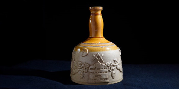 Кувшин в форме молота‑кельмы, украшенный символами английского масонства. Изготовлен в Лейте, Шотландия, примерно в 1875–1900 годах.