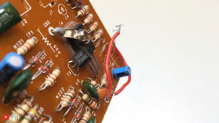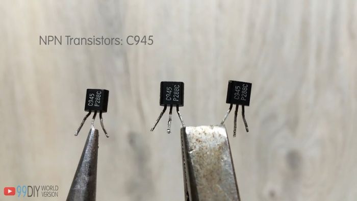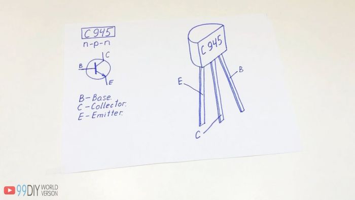 - Транзистор n-p-n структуры. Подойдет практически любой. В примере используется C945.