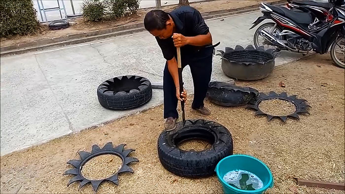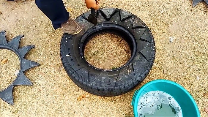 Но привлекательнее и естественнее будет выглядеть изделие, если на его одной боковой поверхности мы вырежем лепестки или листочки разного размера, которые лучше заранее нанести мелом на боковину шины.