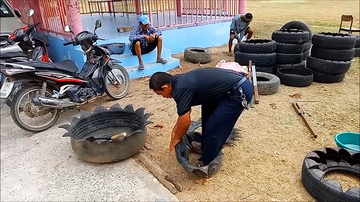 Следующий этап – выворачивание шины наизнанку, который наряду с недюжинной физической силой, потребует понимания и осмысления его принципа. Поможет нам в этом деле «рогатина» из дерева или металла, которой захватываем обрезанный край покрышки, а другой конец упираем в землю.