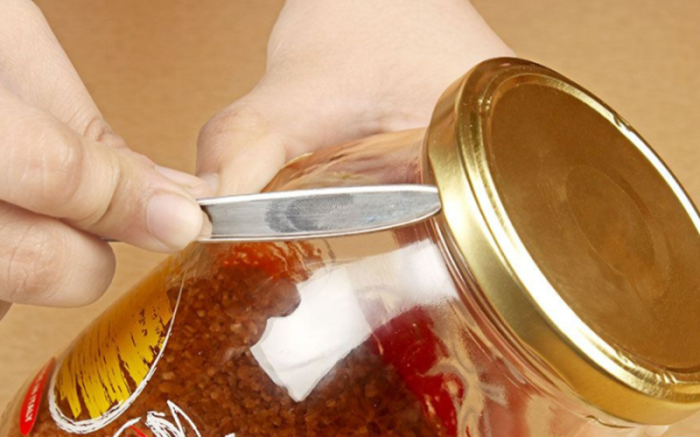 Третий вариант железобетонный, но есть вероятность повредить банку. Необходимо взять нож и кончиком немного поддеть крышку между витков резьбы, выпустив воздух из банки. Ведь именно разность давления возникшая из-за температуры с огромной силой прижимает крышку к банке.