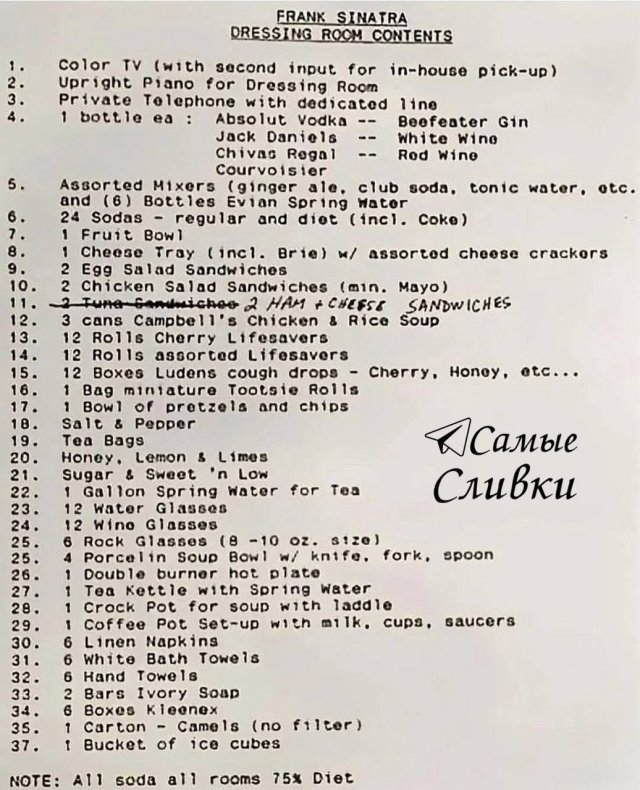 Звёздные капризы всегда интересны. Хотите знать, что просил в гримёрку сам Фрэнк Синатра? Легендарный певец оказался весьма оригинален в своих запросах.