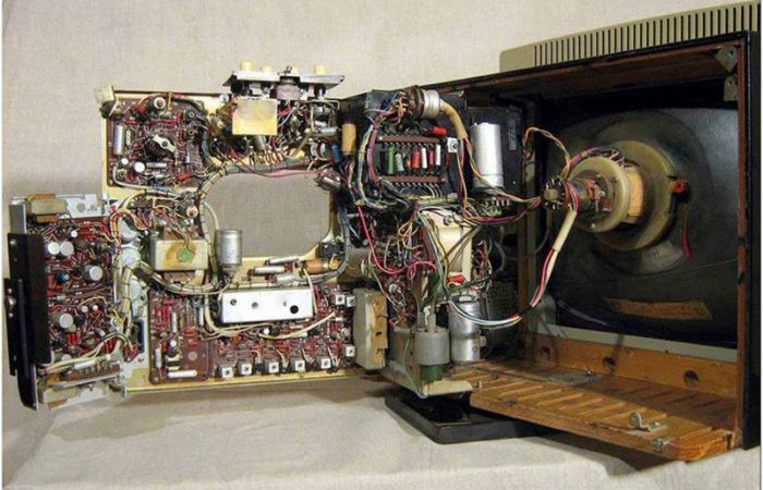 Лампы, трансформаторы и конденсаторы На протяжении многих лет одним из слабых мест отечественных телевизоров оставались конденсаторы. Керамическое изделие регулярно портилось при сильном нагреве, из-за чего нарушалась работа всей схемы. Конденсаторы с электролитом зачастую страдали от быстрого пересыхания последнего, а подчас и вовсе взрывались во время работы… Также многие конденсаторы страдали от потери ёмкости со временем. Другим проблемным элементом конструкции из-за нестабильного качества оставались лампы. Чаще всего беда возникала из-за обрыва обмотки или пробоя изоляции. Кроме того, кинескопы в первых телевизорах постепенно теряли яркость картинки. Происходило это из-за снижения эмиссионной способности. Кстати, именно необходимость замены кинескопа была одним из самых суровых диагнозов мастера.