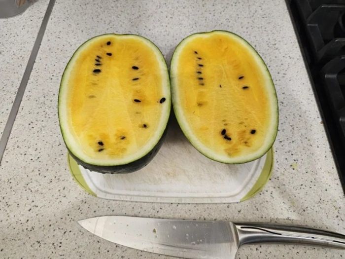 Следующим я попробовал желтый арбуз, который продавался со скидкой по 30 рублей за килограмм. Он оказался чуть лучше предыдущего – присутствовал легкий сладковатый привкус, но в целом тоже был практически безвкусным и явно залежавшимся.