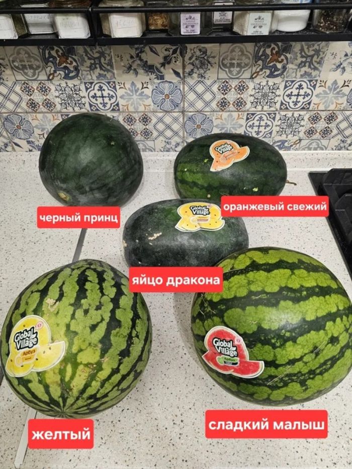 В магазине "Пятёрочка" я приобрел пять разных сортов арбузов, которые отличаются от традиционных как названиями, так и стоимостью – все они стоили около 70 рублей за килограмм.