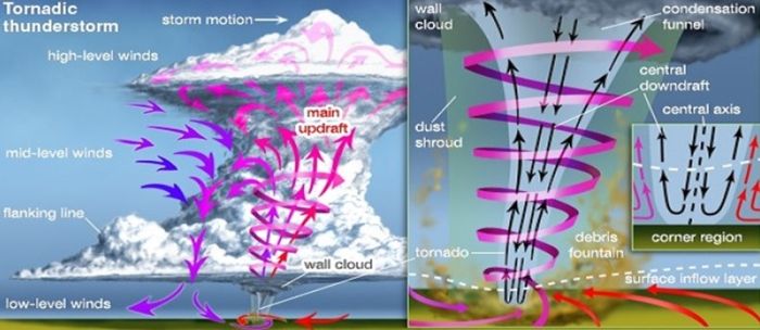 Торнадо же всегда связано с грозовыми облаками, причём с очень мощными и крупными, которые называются суперячейками. В таких облаках неминуемо возникает вращение воздуха – из-за сильнейших восходящих движений, охватывающих переднюю часть облака. Когда воздушные течения сходятся к одной точке, всегда формируется вращение – подобно воронке в сливном отверстии раковины. Вихревое движение в грозовом облаке постепенно передается нижним слоям воздуха – так зарождается торнадо. И в отличие от смерча, торнадо опускается из облака вниз, в виде хобота. В большинстве случаев торнадо оказывается мощнее смерча.
