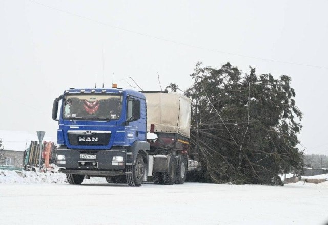В Енисейск к праздникам решили подготовиться креативно. Главную ёлку привезли из леса, но в дороге она слегка «похудела» — часть веток пострадала при транспортировке.
