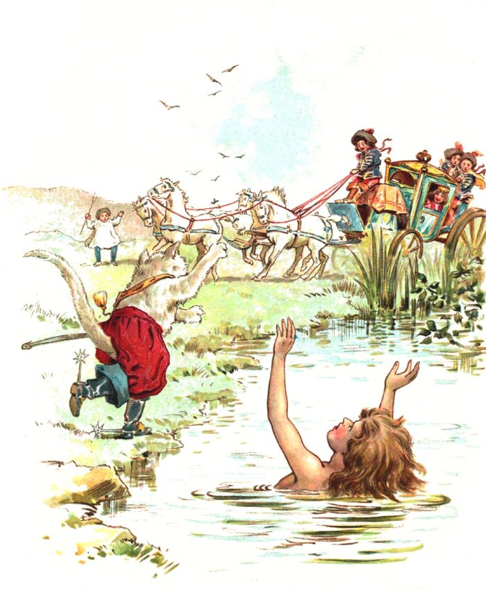 Дальше вы, в общем, все знаете - кошка поймала зайца, отнесла в королевский дворец, где презентовала его как подарок от своего могущественного родовитого господина... Потом слугам короля пришлось вытаскивать благородного Константино Счастливчика из реки и одалживать ему богатые одежды. Затем влюбившаяся принцесса, путешествие с королем и все встречные орут по наущению кошки "Маркиза, маркиза, маркиза Карабаса", извините, "Эти стада Константино, и эти луга - Константино", потом чужой замок, выдаваемый за свой...