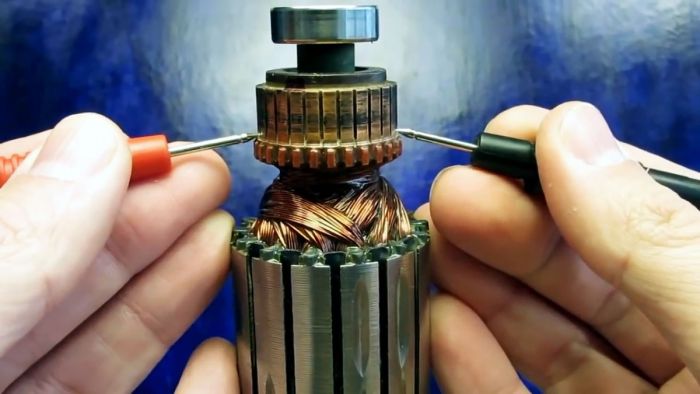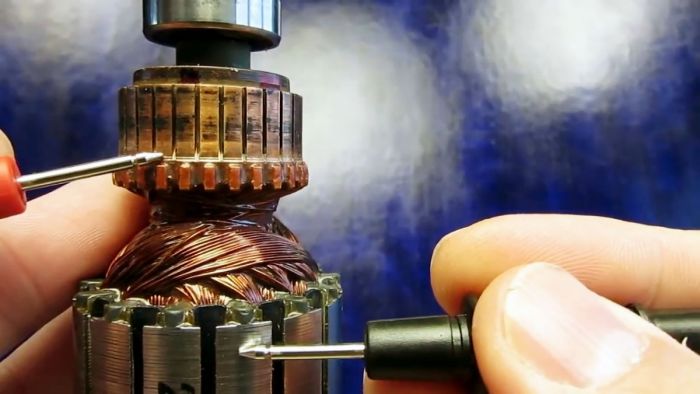 Для начала разберем электродвигатель и извлечем якорь. Необходимо его осмотреть. Часто повреждение обмотки видно невооруженным глазом. Если обрыва проводов и места короткого замыкания не видно, проводим три теста.