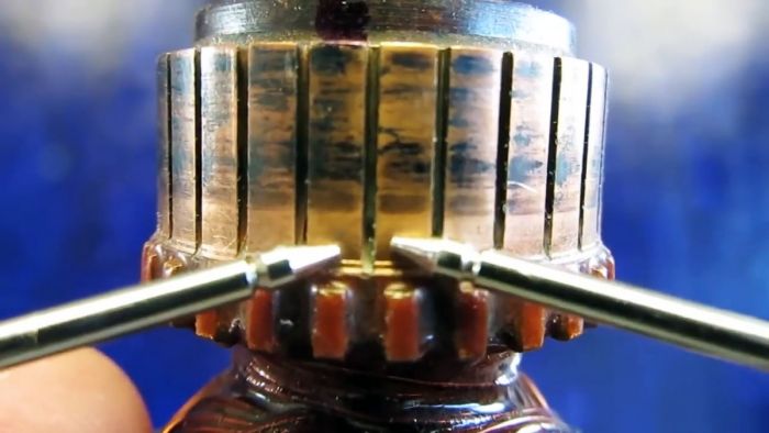 - Один щуп прибора ставим на пластину коллектора, второй на корпус якоря (вал или магнитопровод).