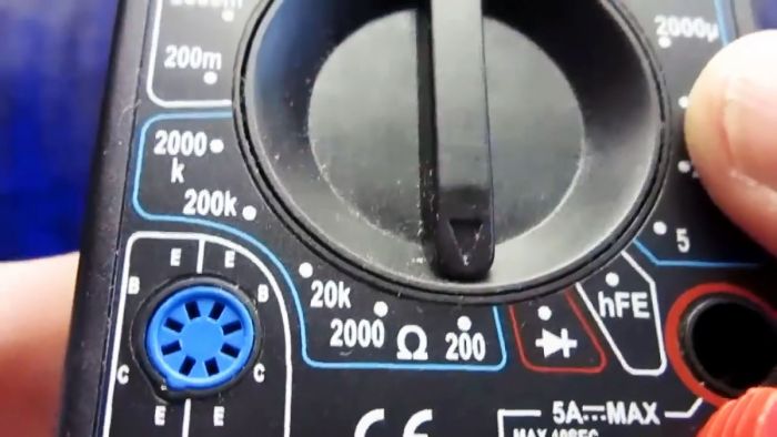 - Мультиметр устанавливаем в режим измерения сопротивления, предел измерения 200 Ом.