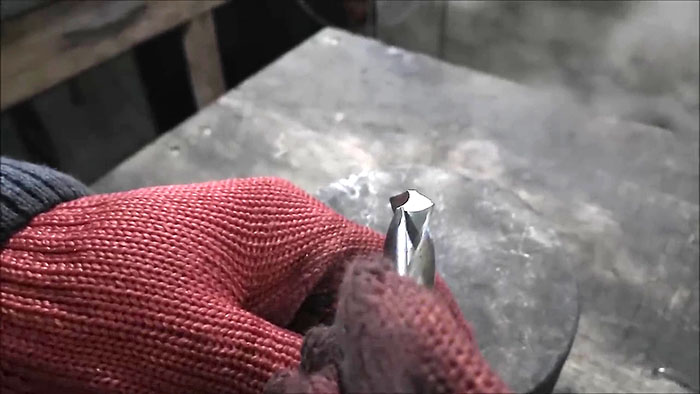 Берем побывавшее в работе сверло, со сбитыми режущими кромками и попробуем его заточить. Находим правильное положение инструмента в пространстве, начинаем заточку.
