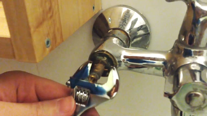 4. Выкручиваем буксу из смесителя. Применяем специальный газовый ключ (разводной), при отсутствии такового можно использовать обычный рожковый или головку.