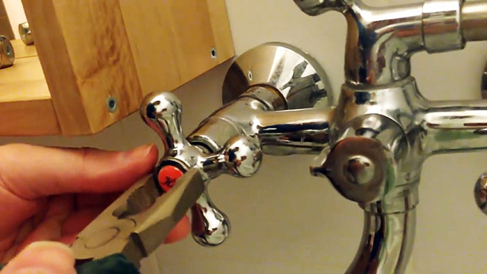 Прежде чем начать любые работы на водопроводе в квартире или доме необходимо выключить подачу воды. Для этого нужно закрутить вентили холодного и горячего водоснабжения в узле ввода, причем вне зависимости от того что вы делаете, перекрываются оба вентиля. Замена буксы (картриджа) в смесителе выполняется в таком порядке: 1. Выкручиваем декоративную заглушку, вращая ее пальцами против часовой стрелки. Если их усилия недостаточно предварительно проворачиваем заглушку плоскогубцами. На некоторых моделях заглушка крепиться без резьбы и для того чтобы ее вынуть нужно просто поддеть ножом или отверткой.