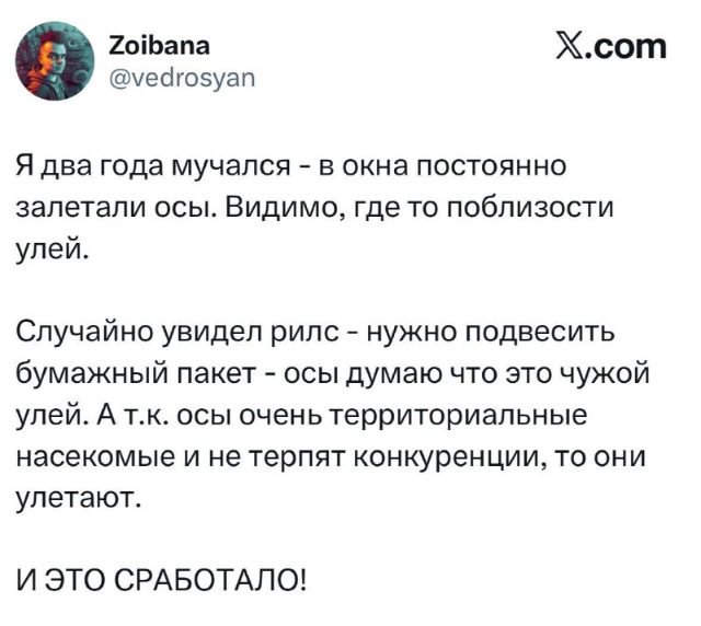 Решение оказалось неожиданно простым - в окно достаточно повесить бумажный пакет. Ос он вводит в заблуждение: они воспринимают его как чужое гнездо и избегают территории. По словам автора, метод сработал практически сразу и позволил избавиться от назойливых визитов насекомых. Лайфхак быстро разошёлся в соцсетях как простой способ летней защиты жилья.