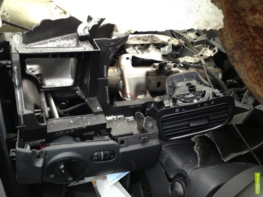 Случилось все настолько быстро, что никто в салоне не успел среагировать. Вылетел люк из-под колес двигающейся перед Гольфом Газели, удар был такой силы, что люк вынес лобовое стекло, порвал крышу, часть стойки, разнес панель приборов и рулевую колонку. Общий ущерб автомобилю оценивается около $10,000. Водитель с тяжелыми травмами доставлен в больницу, у него перелом руки, сотрясение и множество мелких повреждений и царапин. Врачи сошлись во мнении, что водителю сначала здорово не повезло, но потом все же повезло. Чуть измени люк свою траекторию, последствия могли быть более трагичными.