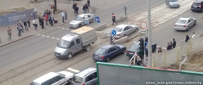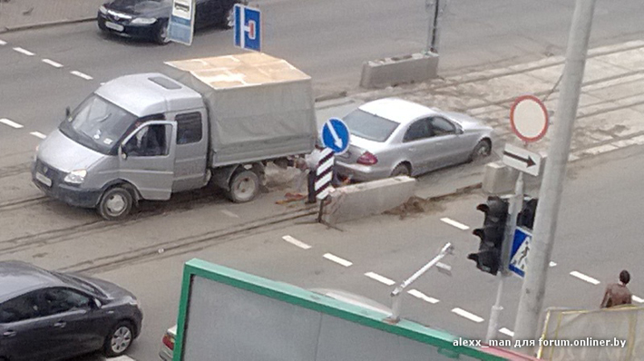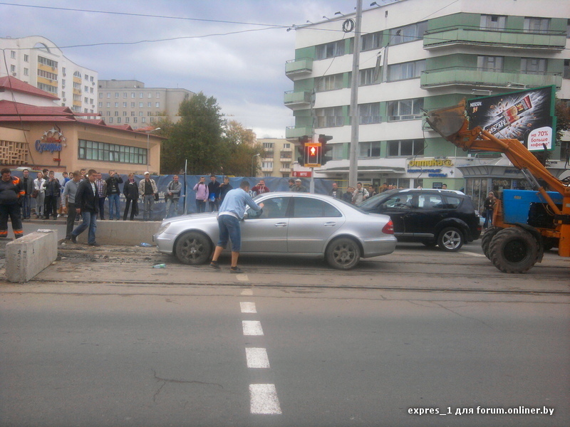Сейчас на участке трамвайных линий возле перекрестка улиц Якуба Коласа и Хмельницкого продолжается реконструкция. Водители, проезжающие ежедневно в этом районе, жалуются на непрекращающиеся заторы. Водитель Mercedes E-Class, видимо, совсем устала ждать, когда пробка рассосется, и решила объехать поток прямо по путям. Однако в результате застряла на гораздо большее время, чем если бы двигалась с общей скоростью: машина увязла в незастывшем бетоне.