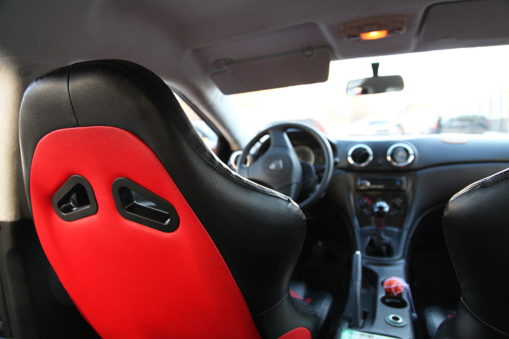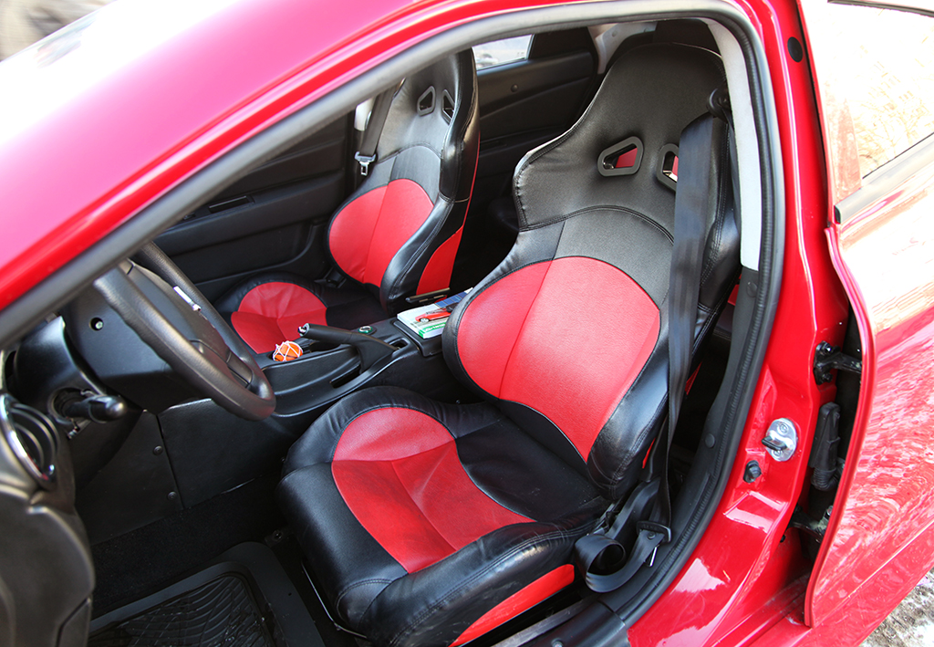 Спереди стоят ковши, обтянутые кожзамом, цвет - в соответствии в цветом кузова (их, кстати четыре - есть ещё желтый, черный и белый). Регулировок только две - по длине и наклону спинки. Руль регулируется только по высоте. Удобное положение найти можно, однако мы отметили не самое удобное расположение педалей.