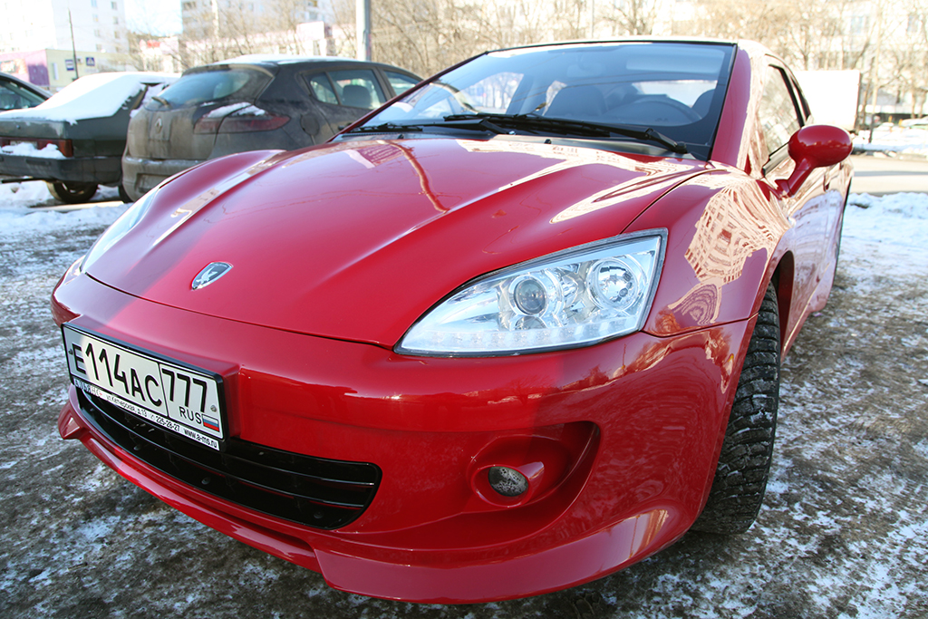 От образов перейдём к мирским качествам автомобиля. Экстравагантная внешность и, главным образом, по-спортивному низкая крыша заставляет изрядно нагибаться при посадке и высадке. Очевидный недочёт - толстые передние стойки вкупе с небольшими проёмами окон. Это сильно ухудшает обзорность, особенно плохо видно пешеходов. Винтов и саморезов на порогах пугаться не стоит: если сборка будет не мелкосерийной, эти узлы будут выглядеть совершенно иначе.