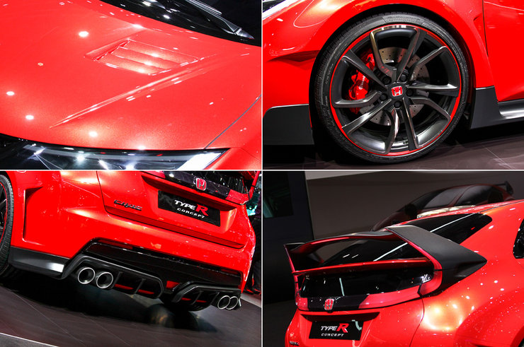 Внешность вряд ли стала для кого-то сюрпризом — дизайнеры концепт-кара Honda Civic Type-R черпали вдохновение в гоночном Сивике заводской команды Honda, выступающей в Мировом Туринге (WTCC). Напомним, с 2014 года в этой серии меняется технический регламент, который позволил расширить колею, что привело к появлению эффектных «раздутых» арок. Так что снаружи Type-R ничуть не скромнее «боевых» Сивиков — в его активе агрессивный аэродинамический обвес с красивым антикрылом, капот с вентиляционными прорезями, четыре патрубка выпускной системы и 20-дюймовые колёса с шинами Continental ContiSportContact 5P.