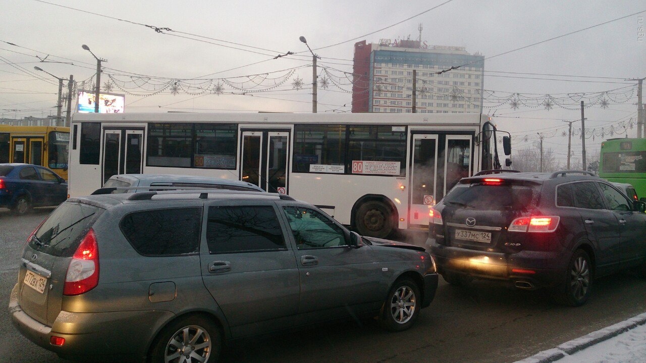 Одна из пробок образовалась из-за ДТП с автобусом на Предмостной площади. Нынче утром «восьмидесятый» перегородил сразу две полосы движения. В итоге сотни людей опоздали на работу!