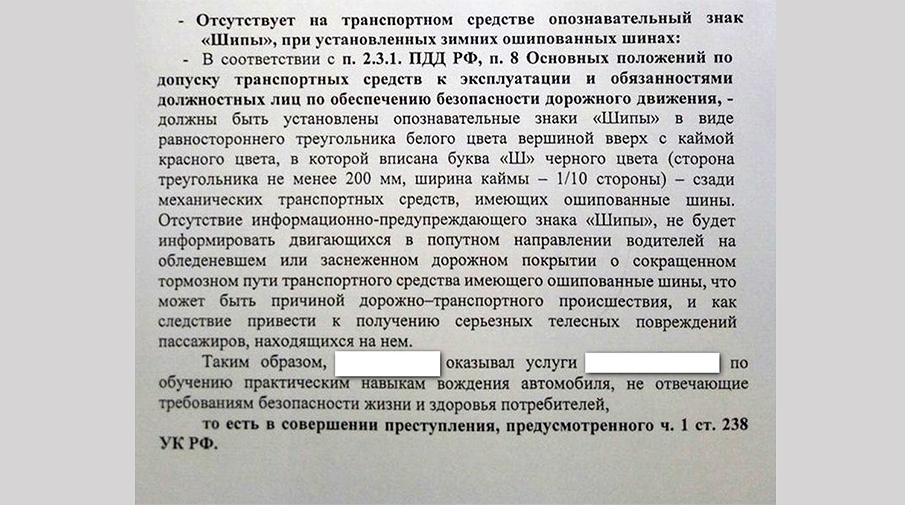 Хотя за отсутствие на стекле автомобиля знака «Шипы» предусмотрен лишь штраф в 500 руб. и запрет на эксплуатацию транспортного средства, некоторые инспекторы уже пытаются разглядеть в этих нарушениях предпосылки для уголовных дел. Как рассказал «Газете.Ru» правозащитник, вице-председатель Комитета по защите прав автовладельцев Александр Холодов, за помощью к нему обратился автомобилист-инструктор, попавший как раз в такую ситуацию. По словам Холодова, 13 апреля 2017 года на Школьной улице в Приморском районе Санкт-Петербурга сотрудники ГИБДД остановили водителя-инструктора, который на своем личном транспорте обучал начинающего автомобилиста. При этом все требования к процессу были соблюдены — на автомобиль были нанесены соответствующие знаки, необходимые документы у инструктора также были.