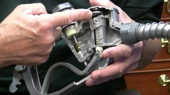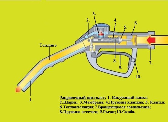 Как известно, бензин является взрывоопасной жидкостью. Кроме того, во время заправки автомобиля максимальная концентрация паров топлива наблюдается как раз в заливной горловине бензобака. Эти условия полностью исключают использование электрических датчиков измерения. Поэтому предохранитель заправочного пистолета всегда механический.