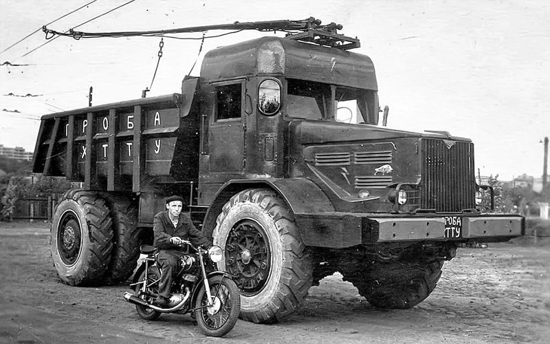 Троллейбус, как известно, штука экономичная и экологичная. Ну об экологии в 1950-х особо не думали, а вот экономичность была актуальна. Вот и изобрели троллейвоз на базе карьерного самосвала МАЗ-525 грузоподъемностью 25 000 кг. Машину в 1954-м сделали совместно с горняками и Харьковским трамвайно-троллейбусным управлением. В движении рогатый МАЗ приводили два электродвигателя Д-202 суммарной мощностью 172 кВт. Машину предназначали для работы в шахтах. Но для сложного и дорогого автомобиля нужно было как минимум протянуть туда тролли. Позднее аналогичные опытные машины строили на БелАЗе и на базе КрАЗа, но дальше испытаний дело так и не пошло.