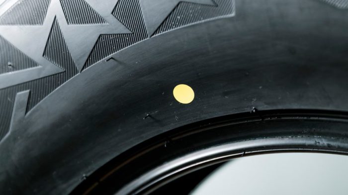 Отдельный моментом являются цветные точки на покрышках. Белая или желтая всегда указывает на самый легкий сегмент шины. Ставят их всегда на внешней стороне изделия. Нужно это для того, чтобы монтаж покрышки был осуществлен правильно. А именно желтая точка должна находится рядом с вентилем, который закономерным образом утяжеляет колесо. Если монтировать в соответствии с правилами, то при балансировке потребуется израсходовать меньше грузиков.