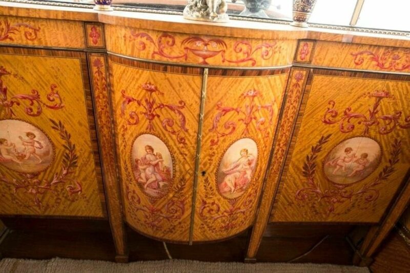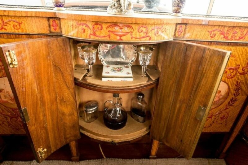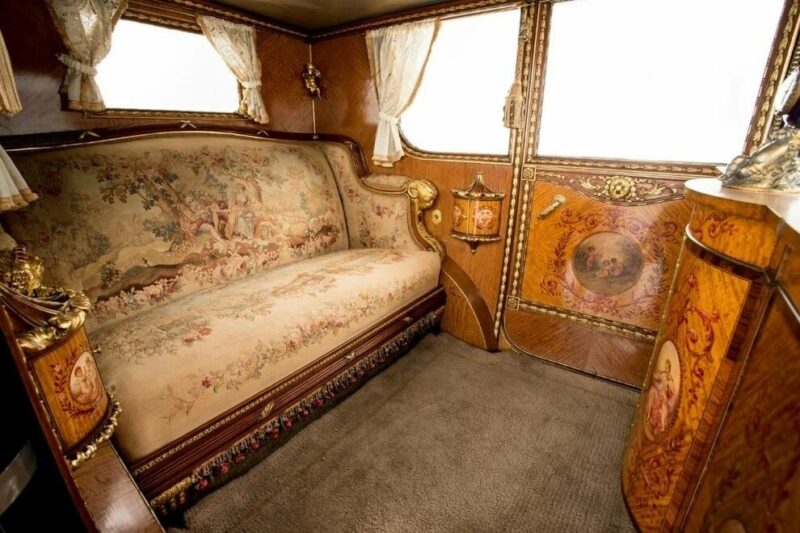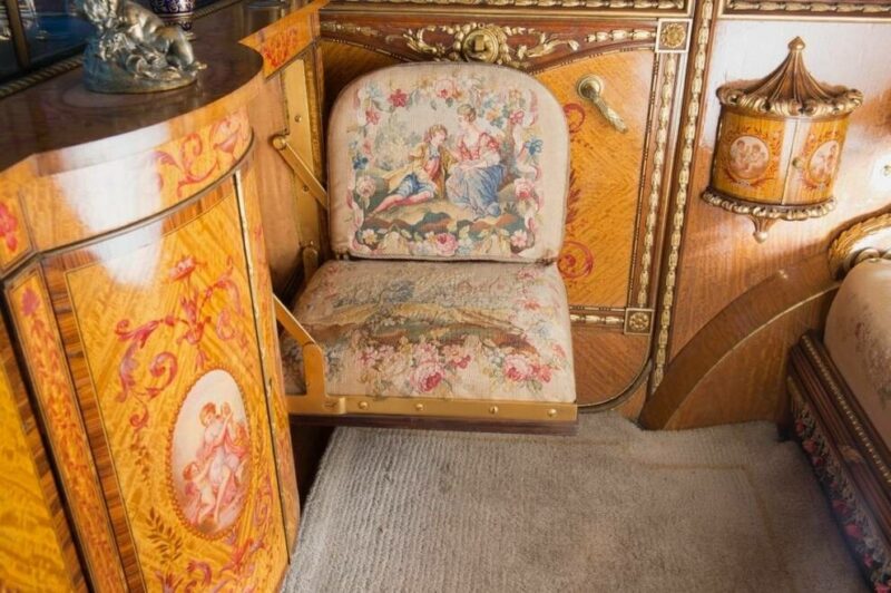 В заднем отсеке также установлен барный шкаф, двери облицованы панелями из красного дерева, установлены французские часы из золоченой бронзы, фарфоровые вазы с каждой стороны и шкафчик для макияжа.