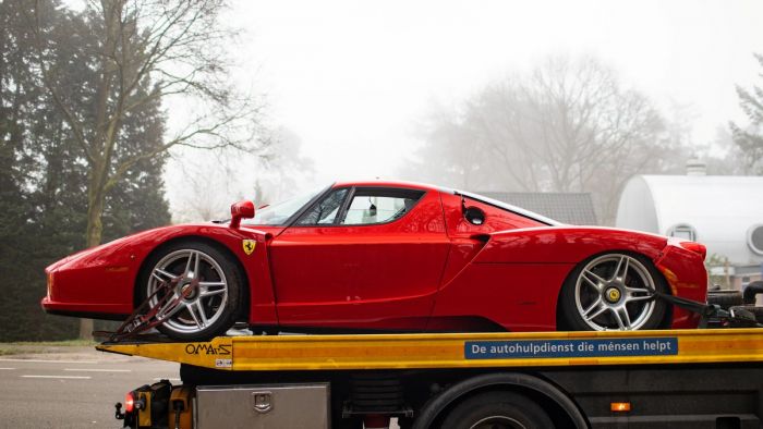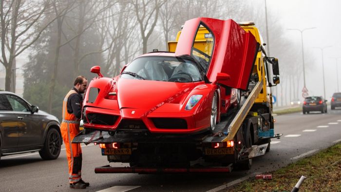 У ярко-красного спортивного автомобиля Enzo, одного из 400 выпущенных, было оторвано два колеса, и это может быть непоправимо.
