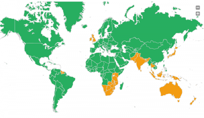 Оранжевый — страны с левосторонним движением.