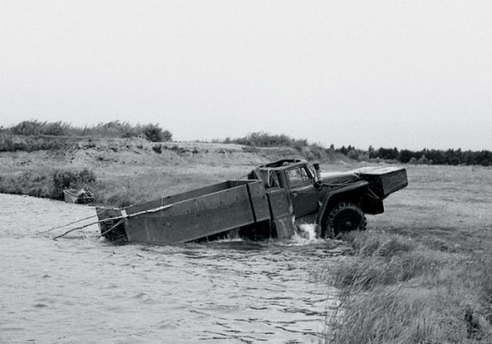 Если про автомобили-амфибии, вездеходы-амфибии и машины-паромы большинство людей хотя бы слышало, то вот плавающий грузовик для большинства наверняка станет откровением! Именно такой машиной является советский Урал-375П. Разработан плавающий прототип был в 1975 году в рамках специальной научно-конструкторской работы по приданию армейским грузовикам плавучести. Для этого 375-ый оборудовали не только подводными винтами, но и герметичным кузовом. В кабине также появился специальный люк для увеличения обзора и повышения безопасности водителя.