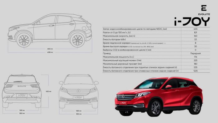 Так, седан будет иметь тяговую батарею емкостью 53 кВт, запас хода в 420 км и мощность электродвигателя 163 л.с. В свою очередь, кроссовер Evolute i-JOY с аналогичной тяговой батареей будет иметь запас хода в 405 км. Мощность его электродвигателя немного выше — 176 л.с. Характеристики спортивного кросс-купе i-JET пока не разглашаются.
