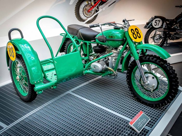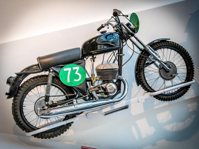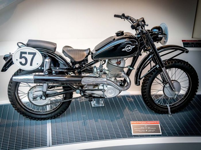 Мотоцикл для многодневных соревнований Иж-57М производства Ижевского машиностроительного завода, 1957 года. Оснащен 2-тактным, 1-циллиндровым двигателем объемом 346 см.куб. и мощностью 18 лошадиных сил.