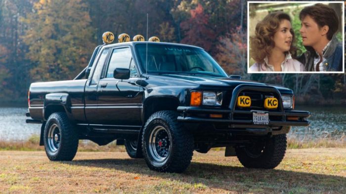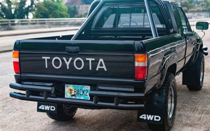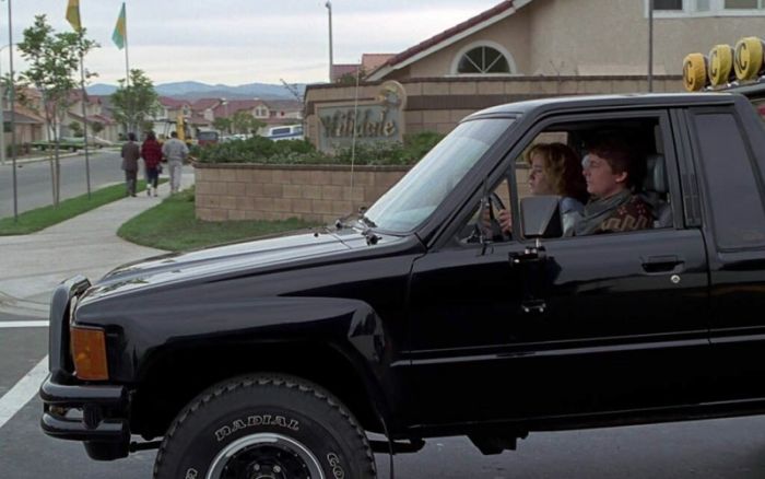 Безусловно главным автомобилем культового фильма «Назад в будущее» является DeLorean DMC-12. Тем не менее в ленте присутствует немало других интересных автомобилей. К примеру черный как смоль Тойота пикап, с ярким внешним тюнингом и высокой посадкой.