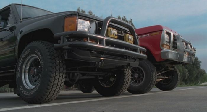 Toyota Truck 4×4 (RN65) — это специальная версия Toyota Hilux для американского рынка. В фильме автомобиль был представлен в редкой модификации SR-5. От базовой модели она отличалась улучшенной отделкой салона, электростеклоподъемниками, кассетной аудиосистемой и рельефными сиденьями. Экстерьер машины был украшен металлическим бугелем, трубчатыми бамперами и массивной дугой безопасности с противотуманными фарами KC Daylighter. Взамен штатных колес устанавливались 15-дюймовые колесные диски 94 US Wheel с покрышками Goodyear Wrangler. Дабы зрители опознали какой марки перед ними автомобиль, в верхней части лобового стекла находилась наклейка TOYOTA.