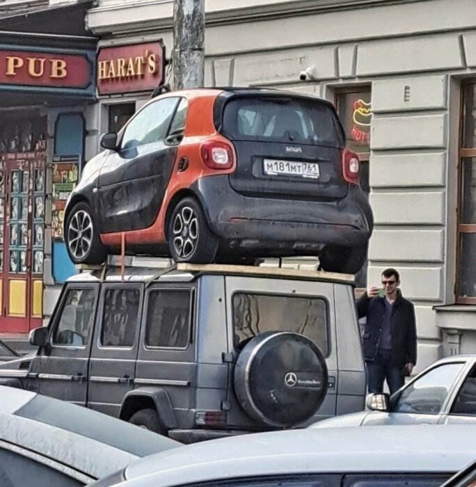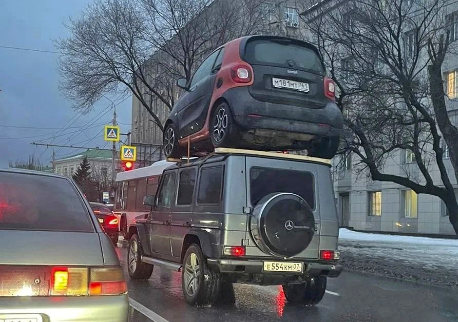 Угорают в Ростове-на-Дону от скуки. Кто-то поставил на крышу своего Гелика маленький автомобильчик Смарт и ездит в таком виде по городу. ГИББД сначала останавливали, но потом убеждались, что правилами не запрещено, отпускали, теперь просто машут рукой. Груз? Груз. Лишь бы по высоте не больше 4 метров. А другая это машина или мешки с картошкой – в правилах не указано. А раз не запрещено – значит разрешено.
