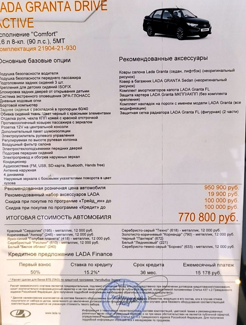 Стоимость дополнительного оборудования снизилась с 460 550 до 19 900 рублей. В итоге цена Lada Granta Drive снизилась с 1 137 900 до 770 800 рублей. Как поменялись цены на Lada Vesta в этом салоне, пока неизвестно.