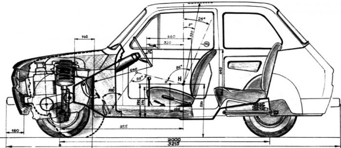 Переднеприводный микроавтомобиль задумывали с двигателем воздушного охлаждения и трансмиссией с клиноременным ремнем. Была даже идея применения роторно-поршневого мотора мощностью 26 л. с., разработанного в Серпуховском ВНИИмотопрома. Фантазии, конечно! Но ведь подходящего для микроавтомобиля современного двигателя в СССР просто не было.